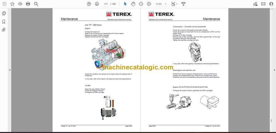 The Terex RC-Series Rough Terrain Cranes (RC35, RC40, RC45) are built to handle jobs where uneven ground and tight maneuvering are part of daily operations. This Operation and Maintenance Manual covers steering modes, boom extension control, hydraulic modulation, outrigger deployment, and maintenance routines that keep these cranes responsive under variable terrain conditions.