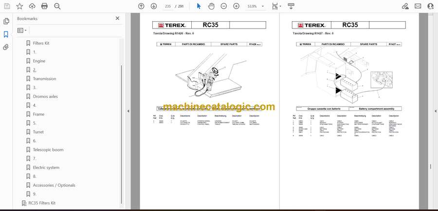 The Terex RC35 Rough Terrain Crane relies on a compact lifting structure and versatile steering system. This Parts Catalog breaks down each core assembly including boom components, winch modules, hydraulic systems, slewing gear, outriggers, and drivetrain mechanisms. Fleet technicians use it to order correct OEM parts with confidence.