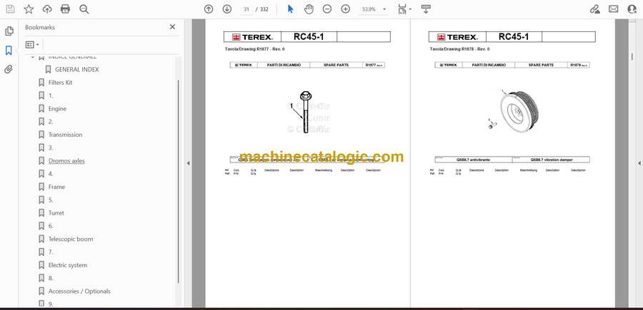 The Terex RC45-1 Rough Terrain Crane relies on a compact but durable structural layout. This Parts Manual lists every mechanical and hydraulic element, including boom sections, slewing gear, winch components, outrigger parts, and driveline assemblies. The exploded diagrams make it easy for technicians to identify the correct part numbers and avoid mismatches when ordering replacements.