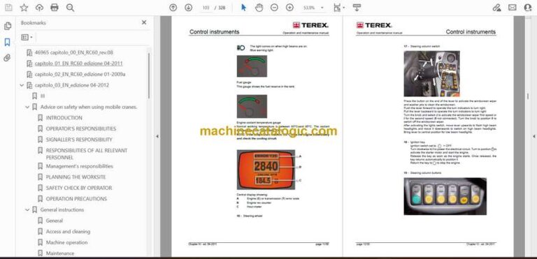 The Terex RC60 Rough Terrain Crane offers dependable performance in challenging field conditions. This Operation and Maintenance Manual covers boom controls, steering modes, hydraulic flow characteristics, outrigger deployment, braking systems, and day-to-day operation best practices. It is especially useful when diagnosing loss of boom speed, swing irregularities, or steering stiffness under heavy loads.