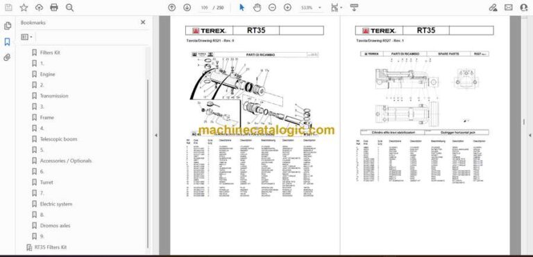 The Terex RT35 Rough Terrain Crane balances lifting capability with maneuverability. This Parts Catalog includes detailed diagrams of structural components, boom sections, hydraulic systems, slewing assemblies, outriggers, and driveline elements. It supports technicians who need precise part identification during maintenance or repair operations.