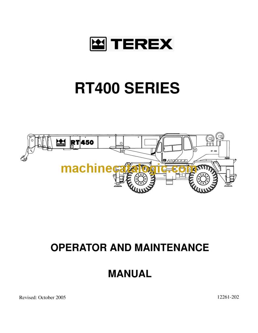 The Terex RT400 Series Rough Terrain Crane is designed for diverse lifting environments where ground conditions constantly change. This Operator and Maintenance Manual blends operational instructions with practical service insights. It covers steering modes, hydraulic modulation behavior, boom sequencing, and outriggers, plus daily and long-term maintenance tasks that keep the crane dependable.