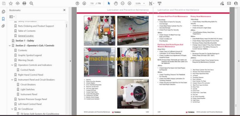 The Terex SKSS-13 Infinity Blasthole Drill is engineered for deep, precise drilling in demanding mining environments. This Service Manual dives into rotary head mechanics, air system routing, hydraulic feed cylinder behavior, and structural stress points that often show early wear. Its diagrams help technicians visualize how each subsystem interacts under load, especially during continuous drilling cycles.