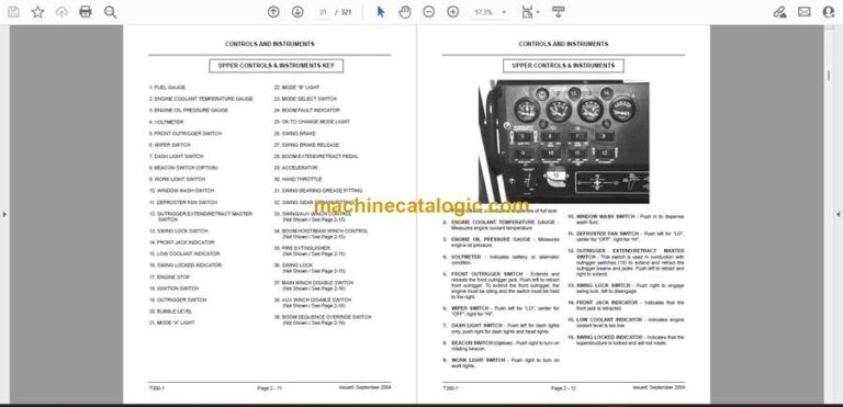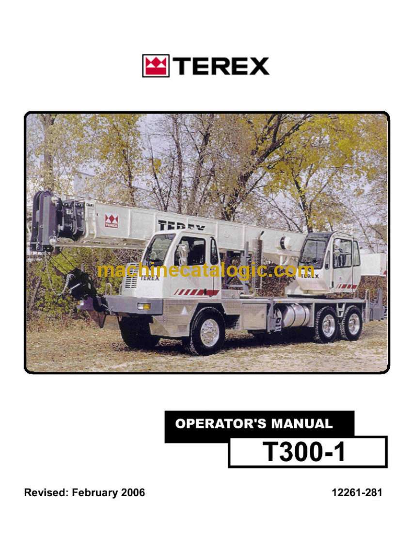 The Terex T300-1 Crane is a versatile lifting machine built for work sites that demand both mobility and precision. This Operator Manual explains how the crane responds to boom extensions, radius changes, outrigger deployment, steering modes, and daily operational routines. It teaches operators how to anticipate load shifts, maintain safe working angles, and keep the crane balanced throughout the lift cycle.