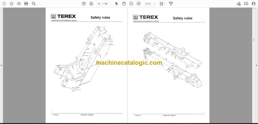 The Terex TFC45 Series Reach Stacker is a container-handling machine known for its massive lifting power and telescopic boom agility. This Maintenance and Operating Manual gives operators a clear view of load charts, hydraulic modulation behavior, electrical fault codes, and the daily checks required to keep the stacker responsive and safe. Technicians lean heavily on its diagrams when tracking down steering anomalies or boom hesitation.