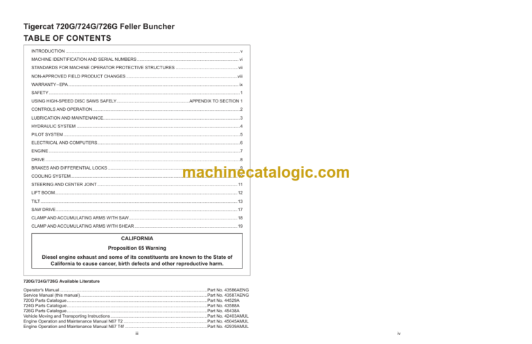Tigercat 720G, 724G, 726G Feller Buncher INDEX: