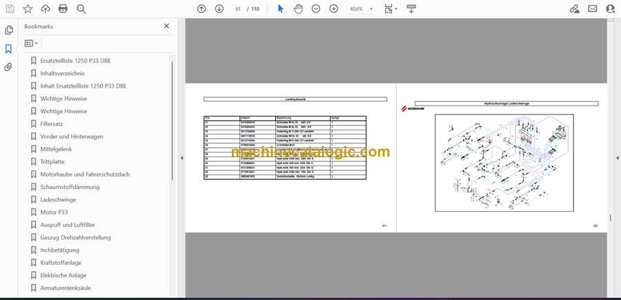 This Weidemann 1250 P33 DBE wheel loader usually lives in tight farmyards, stables, and small construction sites, loading feed, muck, pallets, or aggregate all day. This parts catalog is what I grab when I need to break the machine down on paper before I touch a wrench. If, for example, the loader arm pivot is loose or a hydraulic line is weeping, I use this book to trace the assembly, confirm every bushing, spacer, seal, and fitting, and make sure I’m ordering the right revision of each part.