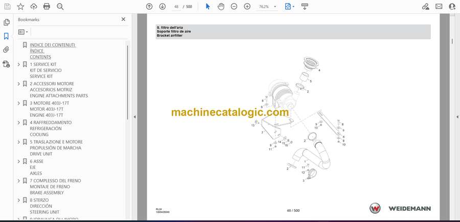 On a Weidemann 1280 wheel loader that’s working in tight farm yards, barns, or small construction sites, this parts catalog is what I’d keep open whenever I’m stripping or rebuilding an assembly. It lets you match what’s in your hands to the exact exploded view, so you don’t guess on seals, pins, or bushings. If, for example, you’re chasing a sloppy quick-attach or a leaking lift cylinder, this book helps you trace the breakdown, verify every small O-ring and spacer, and order the right revision the first time.