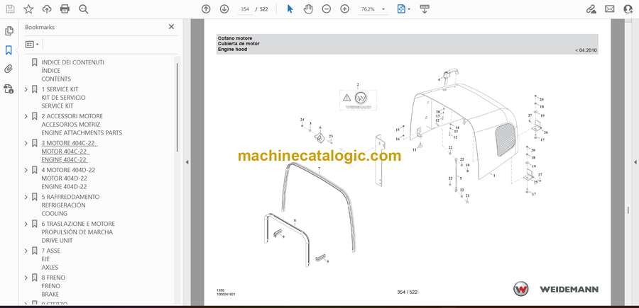 The Weidemann 1350CX45 Kabine wheel loader usually lives in tight farm yards, feed alleys, and construction sites, shuttling material all day. This parts catalog is what I use when I’m tearing into one of these machines and need to be certain I’m ordering the right bits the first time. If, for example, you’ve bent a loader linkage or cracked a cab glass and find a damaged seal or bushing behind it, this book lets you see the full exploded view so you don’t miss the small hardware that actually keeps it all tight and safe.