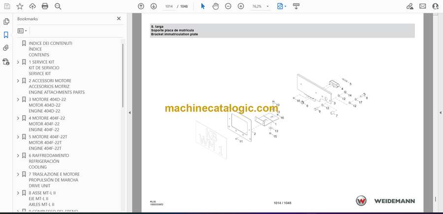 A Weidemann 1880 wheel loader usually lives in tight farmyards, feed alleys, and material yards, shuttling pallets, silage, gravel, and manure all day. This spare parts catalog is what I’d pull up when I’m mid-repair and need to identify the exact revision of a component before ordering. If, for example, a loader arm pin seizes or a steering joint starts to knock, this book lets me break the assembly down on paper, confirm every bushing, shim, seal, and fastener, and avoid guessing at parts over the counter.