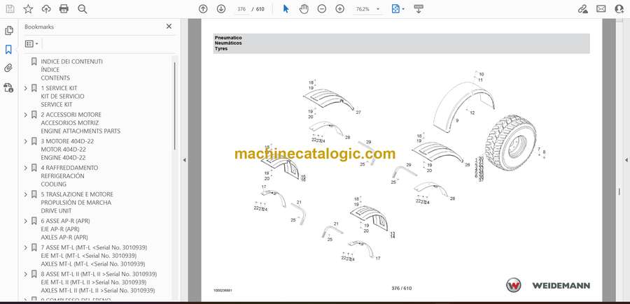 This catalog is what I keep open whenever I’m stripping or rebuilding a Weidemann 2070CX50LP T that’s been working in tight farm yards, feedlots, or warehouse loading bays. The loader spends its life shuttling pallets, bales, and bulk material, so pins, bushings, hoses, and wear pads take a beating. This book lets you trace every component in the telescopic boom, chassis, and attachment interfaces so you can match the exact parts on your machine. If, for example, the boom won’t hold height and you find a leaking cylinder or worn pivot, this catalog helps you identify the correct seal kit, pin, or bearing without guessing.