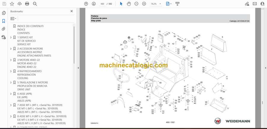 On a machine like the Weidemann 2070CX50LP, working daily in yards, barns, and tight construction sites, this parts catalog is what I’d keep open whenever I’m stripping or rebuilding an assembly. It lets you match what’s in your hands to the correct exploded view so you can trace every pin, seal, and bushing. If, for example, you’ve bent a loader linkage or cracked a hydraulic line, this catalog helps you identify the exact revision of the arm, cylinders, hoses, and fittings so you don’t order parts that won’t line up when you go to bolt everything back together.