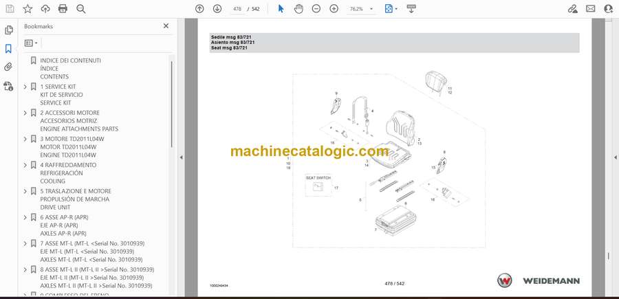 This catalog is what I keep nearby when working on a Weidemann 2070CX80LP T telescopic loader in yards, barns, or tight material-handling sites. The machine spends its life loading, stacking, and shuttling pallets or bulk material, so wear parts and small fittings get damaged or lost. This document lets you pinpoint the exact components for this variant, so you don’t guess at hoses, pins, or seals. For example, if the boom won’t stay up after a hose failure, I use this catalog to trace the correct cylinder seal kit and hardware before I even open the hydraulic circuit.