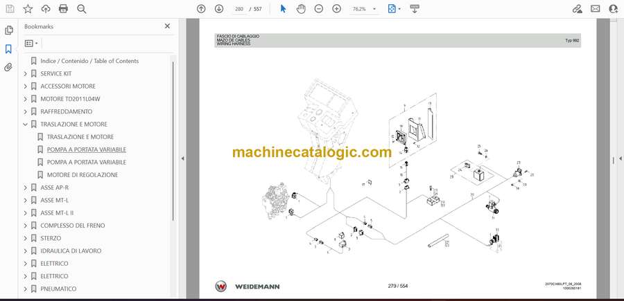 This tele wheel loader usually lives in tight farmyards, feed alleys, and construction sites, doing pallet work, stacking bales, and loading material all day. This catalog is what I’d keep open when I’m stripping down the boom or front axle and need to be sure every pin, shim, and seal goes back with the right replacement. If, for example, the telescopic boom starts leaking or feels loose, I’d use this book to trace the exact cylinder version, boom sections, wear pads, and hose routings before I order anything.