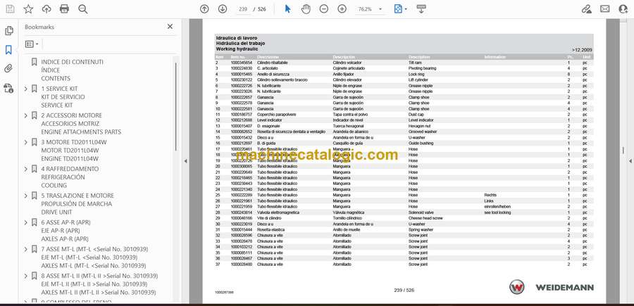 On a 2070CX80LP working in tight barns, yards, or material depots, this parts catalog is what I’d keep open whenever I’m tearing into an axle, loader arm, or cab control. It helps you match the exact Weidemann part to what’s actually bolted on your machine, so you don’t guess from memory. Say you’ve got play in a lift cylinder or a leaking steering joint—this book lets you pinpoint the right seals, bushings, and hardware stack so you rebuild it once and don’t get held up waiting on wrong parts.