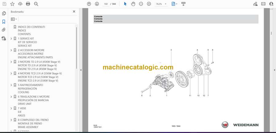 On a Weidemann 3080 Stage V wheel loader that spends its life loading manure, feed, gravel or pallets in tight yards, this parts catalog is what I’d keep open while the machine is stripped in the shop. It lets you match what’s in your hands to the exact exploded view on the screen so you can rebuild an axle end, loader boom pin group, or a leaking hydraulic function without guessing. If, for example, a lift cylinder is weeping and you’re changing seals, this book helps you identify every O-ring, backup ring, bushing and snap ring so you don’t reuse something or order the wrong kit.