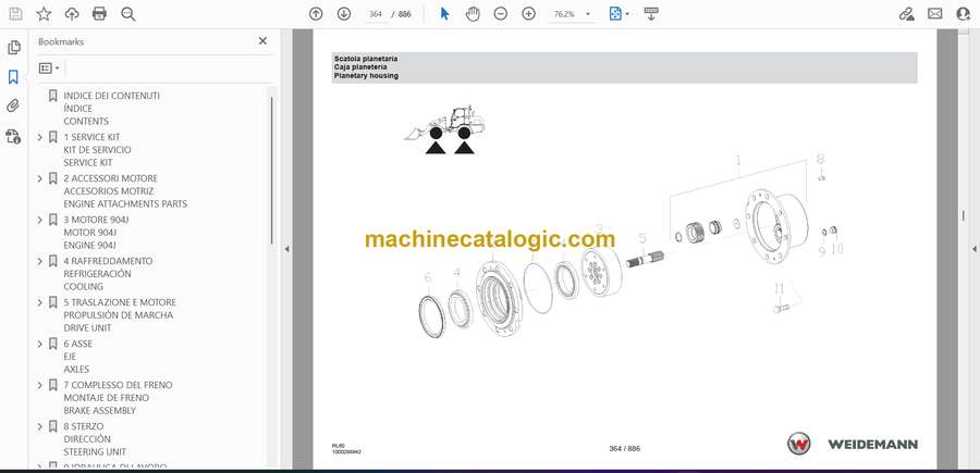 The Weidemann 4080 StageV wheel loader usually lives in yards, farms, and construction sites, shifting bulk material all day in tight spaces. This spare parts catalog is what I keep open when I’m stripping a loader down and need to be sure every seal, bushing, and bracket goes back the way it should—and that I order the right replacements. For example, if a loader arm pin starts knocking or a hydraulic cylinder is weeping, I’ll use this book to trace the exact version of the pin, shims, and seal kit fitted to that particular machine.