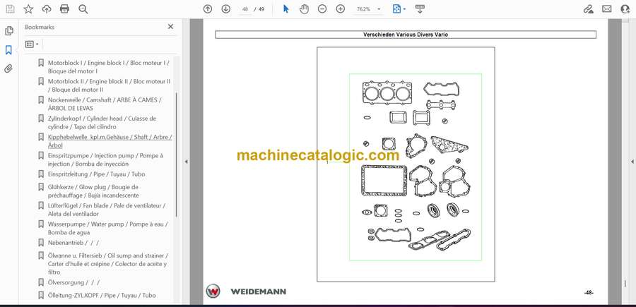 When these Weidemann machines are working in mud, silage, or on a construction site, the Perkins 103-15 engine takes the brunt of it. This parts catalog is what I reach for when I’m rebuilding a top end, chasing an oil leak, or swapping a fuel pump and need to be sure I’m ordering the exact matching parts. For example, if I’ve got oil mist around the timing cover, I’ll use this book to trace the front-end breakdown, confirm the right seal, gasket, and any small O-rings or fasteners that usually get overlooked.